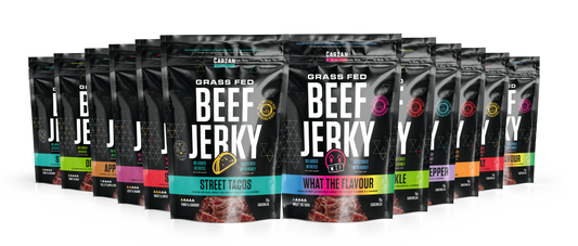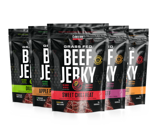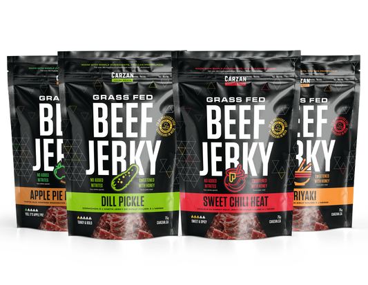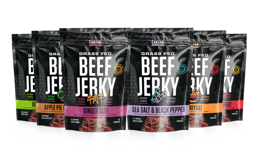Carzan jerky is high in protein, with exact amounts varying slightly by flavour and format. On average, you can expect around 10 grams of protein per serving. Please refer to the nutrition panel on each product page for specific details.